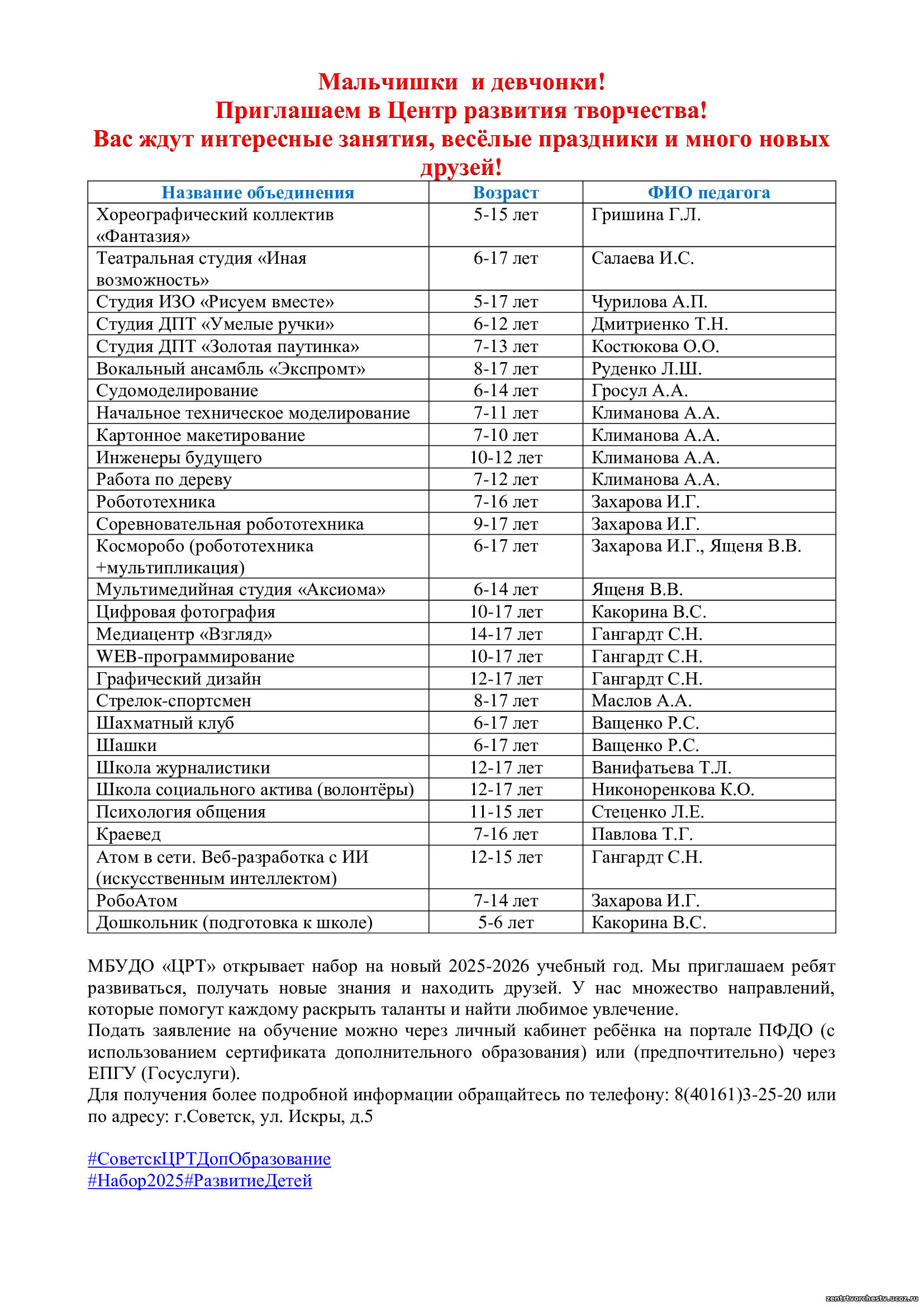 Центр развития творчества приглашает ребят 5-17 лет в творческие объединения на 2025-26 учебный год!